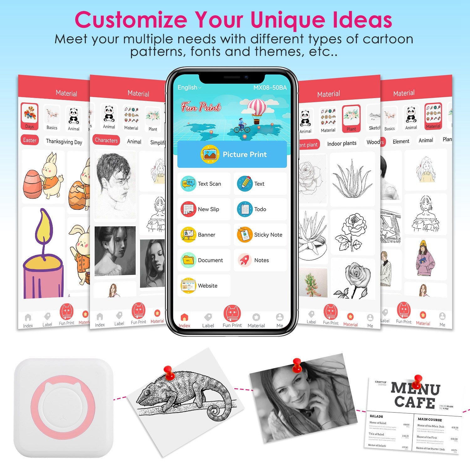• *Multifunctional Thermal Printer*: This pocket printer can not only directly print pictures and labels,but also can print self-edited memos,messages,patterns,lists,etc.. Come with different types of cartoon patterns,fonts and themes,meeting your multiple needs!